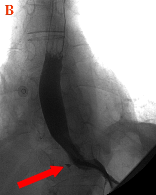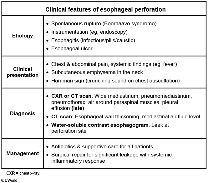 Esophageal rupture is a life-threatening condition that requires emergent evaluation. A contrast esophagram is recommended to confirm the diagnosis and can demonstrate contrast extravasation through the tear. Water-soluble contrast is preferred (less inflammatory to tissues), but a barium study has higher sensitivity and would be advised if the initial water-soluble contrast study is nondiagnostic. If perforation is confirmed, primary closure of esophagus and drainage of mediastinum must be attempted urgently to prevent the development of mediastinitis.
