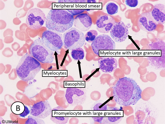 Patients with CML may present asymptomatically, although fatigue, night sweats, weight loss, and abdominal fullness (due to splenomegaly) are not uncommon. Patients may experience weight loss and early satiety from splenomegaly. Peripheral blood smear in CML reveals dramatic leukocytosis (often >100,000/mm3) with absolute basophilia and a shift toward very early neutrophil precursors (promyelocytes, myelocytes).