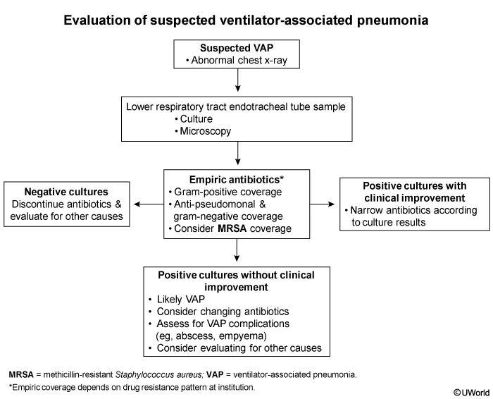 The first step is to obtain a chest x-ray. Patients with a normal chest x-ray are unlikely to have VAP and should be evaluated for other causes. Those with an abnormal chest x-ray (eg, alveolar infiltrates, air bronchograms, silhouetting of adjacent solid organs) require lower respiratory tract sampling (ie, tracheobronchial aspiration) for microscopic analysis (Gram stain) and culture (Choice E). Patients should receive empiric antibiotics (usually gram-positive, anti-pseudomonal, and gram-negative coverage) until culture susceptibility results return as treatment delay can increase mortality. However, respiratory tract sampling should be done prior to starting antibiotics as treatment can decrease the sensitivity of both the Gram stain and culture.