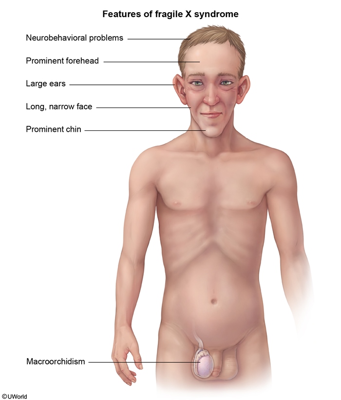 Fragile X syndrome (FXS) is an X-linked disorder that is the most common cause of inherited intellectual disability. Expansion of CGG' trinucleotide repeats in the fragile X mental retardation 1 gene of the X chromosome leads to the classic phenotype in affected males: large head, long face, prominent forehead, protruding ears, and macroorchidism. Female patients with the full mutation may have normal intellect, but many have mild intellectual disability and behavioral problems.