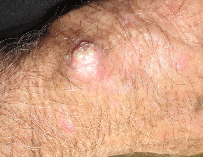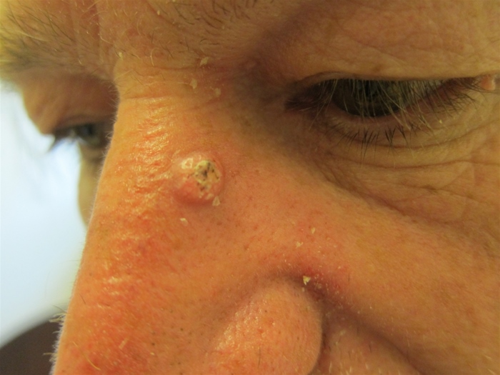 Keratoacanthoma is a rapidly growing, "volcano-like" nodule with a central keratotic plug. Although these lesions may regress spontaneously, many are treated as well-differentiated squamous cell carcinomas. Early treatment is indicated if the lesion is near an important structure, such as the eye.