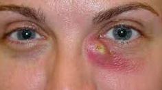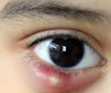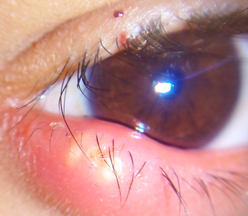 (Choice C) Hordeolum refers to an abscess located over the upper or lower eyelid. It is usually caused by Staphylococcus aureus. It appears as a localized red, tender swelling over the eyelid.